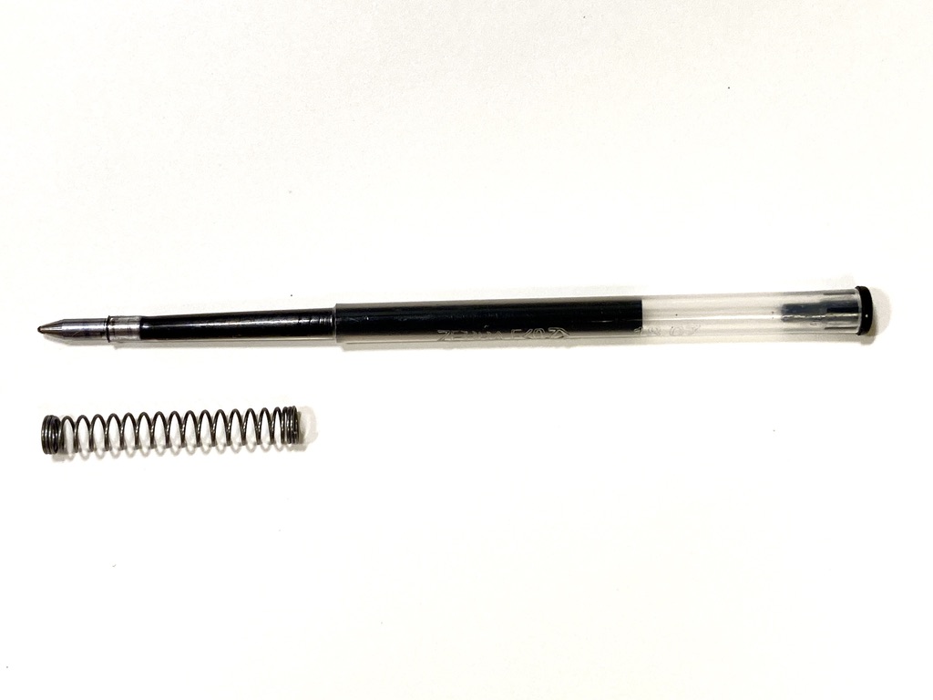 リフィルはF<0.7>というプラスチックスリーブのものが使われています。このリフィルは日本では発売されていませんが、F-0.7芯が使えるようです。F-0.7芯は金属スリーブのリフィルですが、問題なく使えました。ただし、リフィル重量が純正は1.1 g、F-0.7芯は2.8 gなので、ペン全体としては1.7 gくらい重くなります。Amazonなどでは樹脂製のF-0.7芯というのが売られているようです。こちらはリフィルにバネが付属された状態で売られています。
