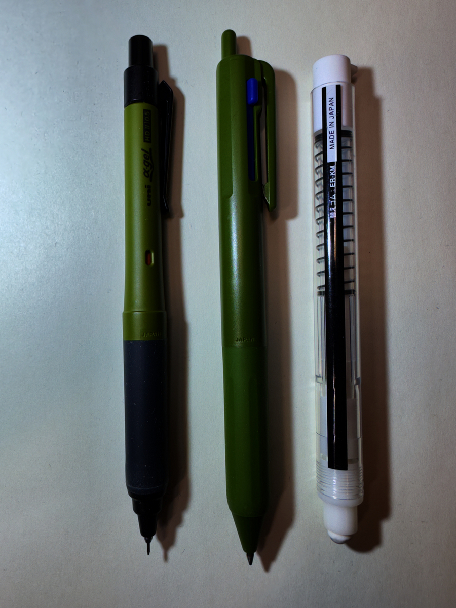 この中でも、メインはアルファゲルスイッチと新3色ボールペンがメインと考えています。実際はもう少し濃い緑で、色の組み合わせが気に入っています。