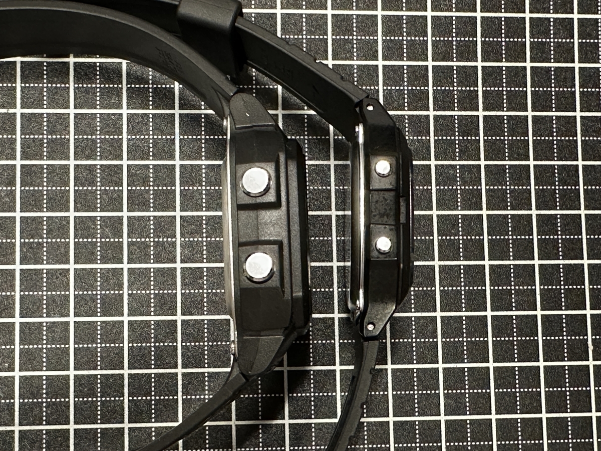 本体が分厚いチプカシは側面にこのような模様があります。隙間ではなくて、おそらく金型の合わせ目です。G-SHOCKなどはこういう成形によってできる余計な構造をできるだけ目立ちにくく作っています。しかし、安価な時計は金型が高くなるような工夫はありません。私はそれでいいと思います。高いものは高いなりに理由があり、安いものには安いものの理由がある。その範囲でどこまでいいものを作れるかがメーカーの腕の見せ所です。