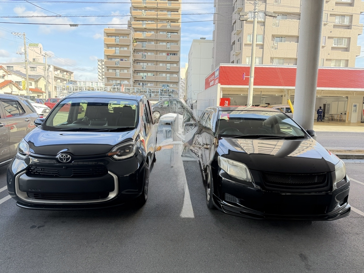 左が新しいシエンタで、右がこれまで乗っていたカローラフィールダーです。シエンタの色は黒に見えますが、ダークグレーです。